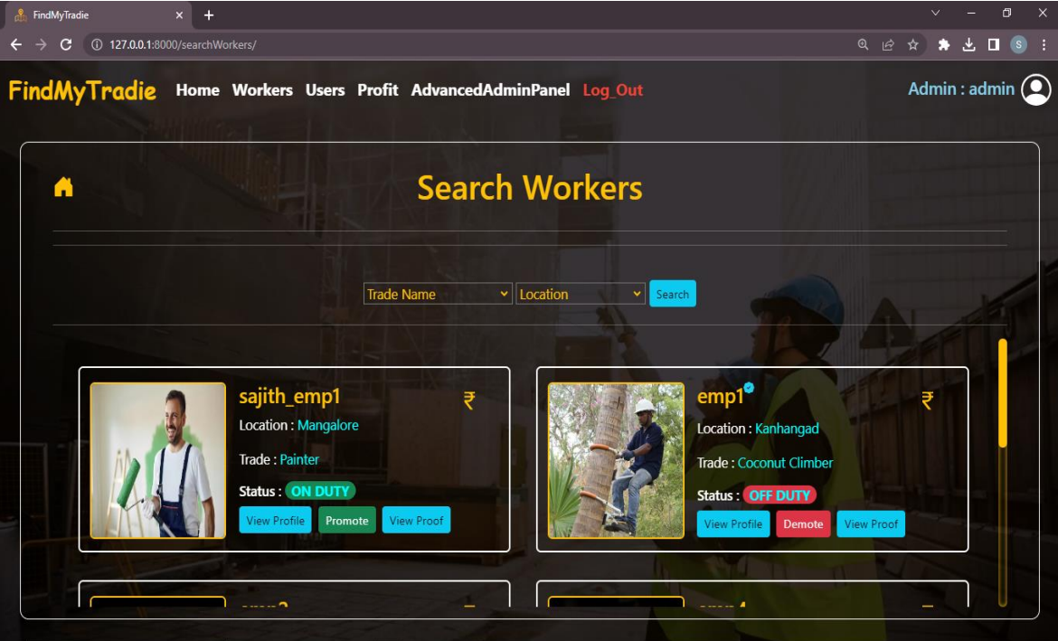 Python Django platform for users to find and hire skilled tradespeople based on location, trade, and user reviews.