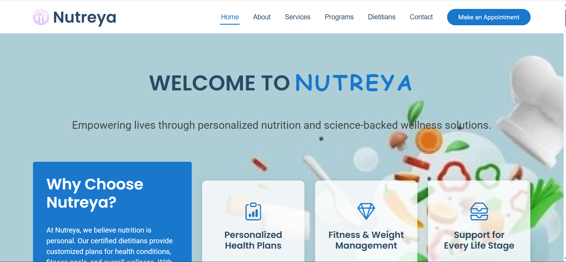Diet consultation site with direct WhatsApp, email, and phone interactions. Includes basic SEO for better search engine visibility.